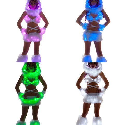Faux Fur Light Up SkirtFully LinedFabric: 100 % Acrylic Faux FurWash: SPOT WASH/KEEP BATTERIES DRYMade in USA